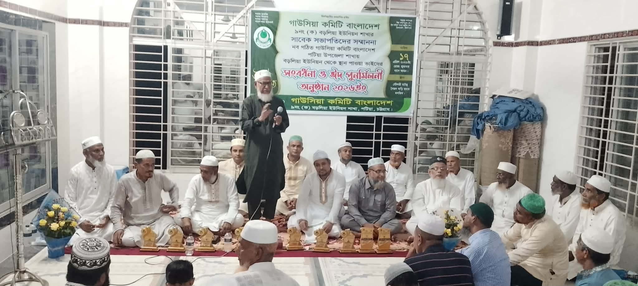 পটিয়া (চট্টগ্রাম) প্রতিনিধি:চট্টগ্রামের পটিয়া উপজেলাধীন ৯নং (ক) বড়লিয়া ইউনিয়ন গাউসিয়া কমিটির ব্যবস্থাপনায় সাবেক সফল সভাপতিগণের সম্মাননা, নবগঠিত উপজেলা কমিটিতে স্থান পাওয়া ইউনিয়নের সদস্যদের সংবর্ধনা ও ঈদ পুনর্মিলনী অনুষ্ঠান সম্পন্ন হয়েছে। গতকাল ১৭ই এপ্রিল (শুক্রবার) বাদে আছর মৌলভী হাটস্থ সৈয়দ বাড়ি নতুন জামে মসজিদ প্রাঙ্গণে এই উৎসবমুখর অনুষ্ঠানের আয়োজন করা হয়। বড়লিয়া ইউনিয়ন শাখার সভাপতি মুহাম্মদ নুরুল আবছার-এর সভাপতিত্বে, সাধারণ সম্পাদক মুহাম্মদ তাজুল ইসলাম খান-এর সঞ্চালনায় অনুষ্ঠানে উদ্বোধক ছিলেন বিশিষ্ট সংগঠক ও কানাডা প্রবাসী সাংবাদিক মফিজুল ইসলাম বাবলু চৌধুরী। অনুষ্ঠানে প্রধান অতিথি ছিলেন গাউসিয়া কমিটি বাংলাদেশ পটিয়া উপজেলা শাখার সভাপতি এম. শহিদুল ইসলাম চৌধুরী (শামীম)। প্রধান বক্তা হিসেবে গুরুত্বপূর্ণ আলোচনা পেশ করেন উপজেলা শাখার সাধারণ সম্পাদক আলহাজ্ব মুহাম্মদ শফিকুল ইসলাম। বিশেষ মেহমান হিসেবে উপস্থিত ছিলেন: ইউনিয়ন শাখার প্রধান উপদেষ্টা আলহাজ্ব মুহাম্মদ আলী আকবর খান, সাবেক সভাপতি মুহাম্মদ জাহাঙ্গীর আলম মাষ্টার, সম্মানিত উপদেষ্টা হাজী বশির আহমদ, হাজী মোহাম্মদ আলতাজ মিঞা মাষ্টার, ইঞ্জিনিয়ার মুহাম্মদ নুর হোসেন, মুহাম্মদ আজম খান, মুহাম্মদ গিয়াস উদ্দীন আহমেদ চৌধুরী পারভেজ, আলহাজ্ব মুহাম্মদ জয়নাল আবেদীন চৌধুরী এবং মুহাম্মদ হোসেন নুর চৌধুরী। বক্তারা বলেন, গাউসিয়া কমিটি আর্তমানবতার সেবায় নিয়োজিত একটি অরাজনৈতিক সংগঠন। নবগঠিত কমিটির মাধ্যমে সংগঠনের কার্যক্রম আরও বেগবান হবে এবং সমাজ সংস্কারে এই ধারা অব্যাহত থাকবে বলে তারা আশাবাদ ব্যক্ত করেন। অনুষ্ঠানে উপজেলা ও ইউনিয়ন গাউসিয়া কমিটির নেতৃবৃন্দ ছাড়াও আওতাধীন বিভিন্ন ওয়ার্ডের দায়িত্বশীল, স্থানীয় আলেম-ওলামা ও এলাকার গণ্যমান্য ব্যক্তিবর্গ উপস্থিত ছিলেন। পরিশেষে মিলাদ, কিয়াম ও দেশ-জাতির কল্যাণ কামনায় বিশেষ মোনাজাতের মাধ্যমে অনুষ্ঠানের সমাপ্তি ঘটে।