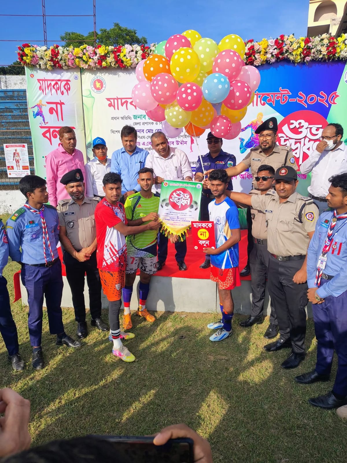 চাঁপাইনবাবগঞ্জে জেলা প্রশাসন ও মাদকদ্রব্য নিয়ন্ত্রণ অধিদপ্তর এবং জেলা ক্রীড়া অফিস যৌথ আয়োজনে মাদকবিরোধী ফুটবল টুর্নামেন্ট উদ্বোধন করেন। “খেলাধুলায় বাঁচে বল, মাদক ছেড়ে খেলতে চল”—এই স্লোগানকে সামনে রেখে (৪ নভেম্বর) মঙ্গলবার বিকাল ৩ টায় চাঁপাইনবাবগঞ্জ নতুন স্টেডিয়ামে যৌথ উদ্যোগে এ টুর্নামেন্টে জেলার ৫ উপজেলা দল অংশ নিয়েছে। আগামী ৯ নভেম্বর ফাইনাল খেলা অনুষ্ঠিত হবে। উক্ত টুর্নামেন্টের সভাপতিত্ব করেন চাঁপাইনবাবগঞ্জ মাদকদ্রব্য নিয়ন্ত্রণ অধিদপ্তরের উপ-পরিচালক চৌধুরী ইমরুল হাসান। মাদকবিরোধী ফুটবল টুর্নামেন্ট উদ্বোধন করেন চাঁপাইনবাবগঞ্জ জেলা প্রশাসক ও জেলা ম্যাজিস্ট্রেট জনাব মোহাম্মদ সোলায়মান। বক্তব্যে জানা যায় , এ আয়োজনের মূল লক্ষ্য তরুণ সমাজকে খেলাধুলায় সম্পৃক্ত করে মাদক থেকে দূরে রাখা এবং সচেতনতা সৃষ্টি করা। টুর্নামেন্ট জুড়ে চলবে মাদকবিরোধী বার্তা প্রচার, পোস্টার প্রদর্শনী ও উদ্বুদ্ধকরণ করবে। মাদককে না বলুন, আয়োজকেরা এই লিফলেট বিতরণ করেন। বিশেষ অতিথি হিসেবে ছিলেন