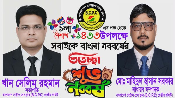 এসো হে বৈশাখ, এসো এসো — বাংলাদেশ সেন্ট্রাল প্রেস ক্লাব (B.C.P.C)-এর পক্ষ থেকে সবাইকে পহেলা বৈশাখ বাংলা নববর্ষের শুভেচ্ছা।