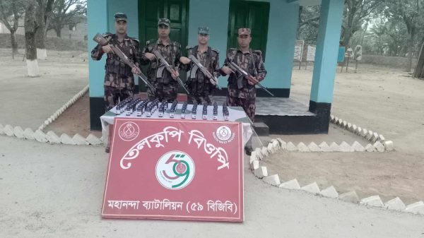 শিবগঞ্জ সীমান্তে ৫৯ বিজিবির অভিযানে ১৮৬ বোতল নেশাজাতীয় সিরাপ জব্দ